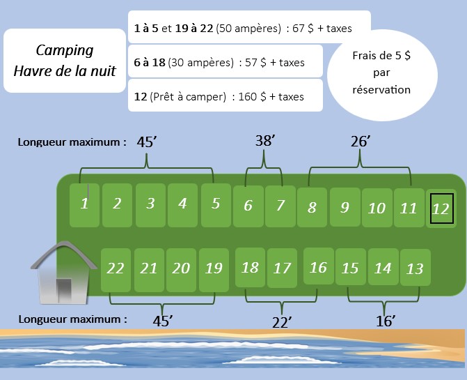 50 ampères, disponibles sur certains terrains seulement (1,2,3,4,5, 17, 18,19,20)
